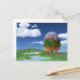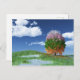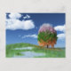 Quatre saisons apparaissent sur un arbre solitaire debout dans une prairie herbacée. Les branches supérieures sont nues et recouvertes de neige, laissant place aux fleurs roses, qui se transforment en feuilles vert foncé, qui tournent orange et or et tombent au sol. Au milieu des feuilles d'automne sur le sol sont des fleurs de printemps bleues et de la neige fondue.