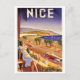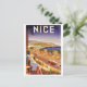 Cette carte postale est une réplique d'une affiche de voyage Art Déco vintage pour Nice, France et est une oeuvre d'art étonnante. L'affiche présente une élégante dame se reposant sur un balcon, avec vue sur la ville en contrebas. La ville est dépeinte dans un style Art déco animé, avec des gens à la mode en train de se promener à côté de voitures classiques sur la route bordée de palmiers. La route tourne autour de la côte jusqu'à des collines à l'horizon, et il y a des gens sur la plage de sable et des bateaux à voile en mer. Le premier plan est rempli de fleurs, ajoutant une touche de beauté et d'élégance à la scène. C'est un excellent moyen de se souvenir de votre voyage à Nice, en France ou de vous inspirer pour planifier un futur voyage.