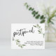 L'avant comporte un en-tête graphique que j'ai conçu en utilisant une police d'écriture moderne et décontractée, qui dit "Postponed". En bas, il y a un message joyeux que vous pouvez éditer, qui déclare votre nouvelle : "Nous nous marions toujours ! En ce moment, nous ne sommes tout simplement pas sûrs de quand cela arrivera." Accentué de deux ressorts de verdure aquarelle, tous les calques ont été ajoutés séparément et laissés déverrouillés pour vous donner un contrôle maximum de la conception. Utilisez les champs modèles pour ajouter vos données personnelles et modifier n'importe quel de mes projets de texte pour répondre à vos besoins et à votre situation.