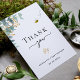 Un carte de remerciements de baby shower moderne et élégant. Un arrière - plan blanc chic. Décoré de feuilles d'eucalyptus couleur verte, de sprigs, de verdure et de faux sprigs dorés. Une jolie petite bourde souriante. Texte noir. Sur le devant le texte : Merci, nom, et une date. Retour : Modèle pour Votre mot de remerciement et nom.