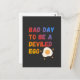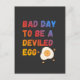 This playful and humorous design features the phrase "BAD DAY TO BE A DEVILED EGG" rendered in a bold, distressed, rainbow-gradient font. Below the text, a delightful cartoon fried egg character with outstretched arms and a wide-eyed, slightly panicked expression perfectly illustrates the pun. It’s a witty graphic, ideal for those who appreciate food-related jokes, clever wordplay, and unique, eye-catching apparel or decor. Perfect for breakfast enthusiasts, culinary humor collectors, or anyone who enjoys a good laugh.