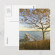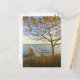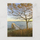 Customisez cette carte postale ! Une jetée privée et un arbre d'automne fin sont baignés de lumière dorée, contre un ciel bleu clair. A l'horizon, les couleurs du coucher de soleil illuminent les petites îles du fond. Photographie de Minerva Bloom.