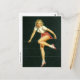 Carte PinUp classique montrant une belle pinup en train de traverser une barrière de fil barbelé et d'y coller sa jupe, peinte par Al Buell (1910-1996)
