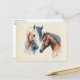 Carte postale avec un beau dessin aquarelle. Avec une paire de chevaux, brun et blanc. Tête et cou visibles avec de la peinture goutte le long de la base de leur cou. L'ambiance du sud-ouest.