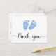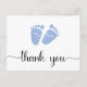 Jolie carte postale de remerciement pour votre douche bébé garçon avec "merci" dans un script élégant avec des swashes et une aquarelle bleue de pieds bébé. Au verso, personnalisez votre message de remerciement ou laissez vide pour une note manuscrite.