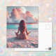 Belle femme méditant sur une plage de sable blanc et de verre de mer brillant. Nuages roses et bleus duveteux et eau bleu pâle.