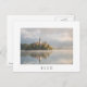 Carte postale d'un lever de soleil brumeux au lac Bled avec l'île avec l'église et brouillard avec réflexion dans l'eau à la première lumière du matin en Slovénie avec une frontière blanche et le texte : 'Bled'.