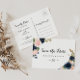 Cette couleur bleue florale d'hiver horizontale sauf la carte postale date est parfaite pour un mariage or. Le design présente de belles peintes à la main bleu foncé, bleu, bleu marine, rose, rousse, fleurs d'or et feuillage vert, entassés dans d'élégants bouquets.