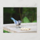 Une photo d'un Blue Jay sur ma table de pique-nique pour obtenir une cacahuète.