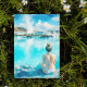 Cette carte postale présente un portrait en aquarelle d'une femme blonde qui regarde la lagune bleue en Islande.