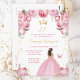 Cette invitation à la fête d'anniversaire élégante et glamour présente une belle princesse aux cheveux brunes dans une robe de bal rose rousse. Le texte combine écriture manuscrite et polices sans serif modernes pour un look élégant et sophistiqué. Les arrangements floraux, papillons et confettis d'or créent un mélange parfait de rustique et de chic. Graphiques par www.etsy.com/uk/shop/SunflowerDayLove