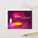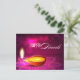 La salutation "Diwali heureux" surimprime un arrière - plan rose avec les globes lumineux de briller léger au-dessus d'une lampe allumée pour envoyer des souhaits chauds pour Diwali. L'inverse indique une petite lampe rose au fond tandis que le message ci-dessus est personnalisable ou peut être handwrite supprimé votre propre message. Disponible avec les produits assortis.