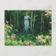 Carte postale d'art raffiné avec le tableau, Edge of the Woods (1921) de Charles Courtney Curran (1861-1942), artiste impressionniste américain. Un paysage représentant une femme en robe bleue parmi les arbres dans les bois, avec des buissons de lauriers de montagne portant des fleurs roses au premier plan.