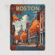 Une affiche de voyage de style rétro saisit une scène de rue charmant à Boston, avec des bâtiments en briques historiques et des arbres à feuilles d'oranges sous un ciel bleu, et "BOSTON" audacieusement affiché au sommet.