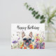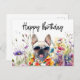 Cette carte d'anniversaire représente un bouledogue français dans un champ de fleurs. Le chien est entouré de fleurs colorées, avec un message d'anniversaire écrit en écriture cursive