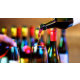 Une main verse du vin rouge dans un verre, avec une rangée de bouteilles de vin en arrière - plan.