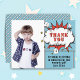 Carte de vœux de remerciement d'anniversaire de bulle de texte de bande dessinée de super-héros garçon. Ajoutez votre photo, message et nom. Carte postale amusante de remerciement d'anniversaire pour garçons.