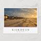 Photo carte postale d'une rangée de cabines de plage sur la plage de la mer du Nord de Kijkduin à La Haye pendant un joli coucher de soleil dans la Pays-Bas avec un bord blanc et dans une boîte blanche le texte 'Kijkduin, Pays-Bas'. La boîte a des rayures en rouge, blanc et bleu, les couleurs du drapeau néerlandais.