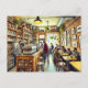 La peinture à l'aquarelle représente l'intérieur d'un petit café exigu à Vancouver. L'espace est serré, rempli de tables en bois et de chaises dépareillées, créant une atmosphère animée mais cosy. Les murs en briques apparentes sont ornés de photos encadrées et de petits plantes en pots, apportant une touche personnelle et rustique. Le comptoir, en bois récupéré, est composé de jarres de pâtisseries et d'une machine à expresso vintage. Un barista en chemise plaid est occupé à servir une ligne de clients, tandis que les clients s'assoient épaule contre épaule, sirotant du café ou travaillant sur des ordinateurs portables. La lumière jaune chaleureuse et quelques traces de lumière naturelle provenant d'une petite fenêtre renforcent le charme intime de ce café animé