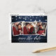 Script de calligraphie moderne, Bois bleu rustique et lumières à cordes, Enregistrer la date Fiançailles Faire-part Couple 3 Photo Carte Postale