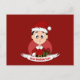 Carte postale avec l'illustration d'un joli garçon aux cheveux noirs souriant, il porte un costume de Père Noël rouge et blanc et tient un cadeau; avec le texte modifiable modèle pour votre nom ou message, le design de Noël avec un arrière - plan rouge