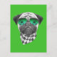 Ce design présente un portrait de carlin en verre et un foulard à damiers noir et blanc.