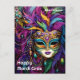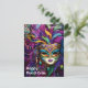 💚 💜 💛 La carte postale présente un étonnant gros plan d'un artiste de performance Mardi Gras, captivant par sa présence entrainante. Leur visage est orné d'un maquillage complexe et magnifique, d'une fusion fascinante de violets profonds, de turquoise vibrante et d'or chatoyant, créant une allure éclatante. Le maquillage met en évidence leurs yeux, ajoutant une qualité éthérée à leur apparence. Un magnifique masque fait honneur à leurs traits, décorés avec soin d'un véritable étalage de plumes violettes, jaunes et bleues qui cascades dans une floraison gracieuse. Des pierres étincelantes embellissent le masque, ajoutant une couche supplémentaire d'opulence et d'allure. La combinaison des couleurs riches et des pierres précieuses crée un effet visuel à couper le souffle, symbolisant l'extravagance et la célébration de Mardi Gras.