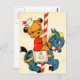 Carte d'anniversaire très vintage illustrant un petit ours en costume de marin et casquette à cheval carrousel bleu. Le cheval a une "selle" qui a un gâteau d'anniversaire et des bougies dessus.