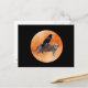 Un corbeau perché sur un chat gris sous une pleine lune orange.