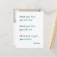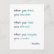 "Ce que vous pensez, vous devenez. Ce que vous ressentez, vous attirez. Ce que vous imaginez, vous créez." Véritable sagesse de Gautam Bouddha - une citation sur la vérité de la vie à votre sujet, une citation pour vous aider à mieux vous comprendre et votre vie, une citation sur votre réalité. En vedette ici sur une carte postale personnalisée cool avec votre message personnalisé / note à l'arrière dans élégant faux script or / typographie. Entrez simplement votre message / note, pour personnaliser. Fait un grand cadeau pour les amis et la famille, pour la remise des diplômes, anniversaire, noël, vacances, nouvelles années, et plus.
