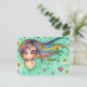 Carte postale avec un crayon coloré illustration traditionnelle d'une fille aux grands yeux violets flottant sur un arrière - plan vert turquoise. Ses beaux cheveux longs coulent à droite et sont faits de brins bleus, roses, violets et jaunes qui donnent l'impression d'un arc-en-ciel. Autour d'elle, il y a des étoiles et des coeurs éparpillés.
