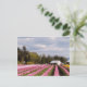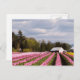 Le champ de tulipes roses avec les bâtiments agricoles, les arbres et les contreforts qui entourent la vallée de Skagit est un joli et unique morceau d'art photographique floral.