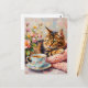 L'image est ornée d'un chat tabby moelleux, brun et noir aux yeux jaunes frappants. Le chat est niché dans une couverture molle en tricot rose. Au premier plan, une délicate tasse et soucoupe bleu clair ornée de petites fleurs roses et de garnitures dorées, remplie de thé. Un bouquet de fleurs roses et jaunes aux feuilles verts est placé près de la tasse.