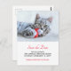 Noël sauvez la carte postale de la date avec une jolie photo de Noël d'un chat tabby gris mordant joyeusement un chapeau santa rouge. Ses gros pattes moelleuses rendent cette photo très agréable.