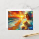 L'image représente une scène vibrante et colorée avec une qualité surréaliste et onirique. Il dispose d'une plage au coucher du soleil ou au lever du soleil avec le soleil bas à l'horizon, jetant une lumière chaude sur l'eau. Le ciel et les environs sont façonnés en motifs tourbillonnants de teintes orange, jaune, bleue et rouge qui suggèrent mouvement et énergie. Au premier plan se trouve un gros chat à fourrure longue, principalement dans les tons blanc et orange. Le chat est assis et semble calme au milieu de l'environnement dynamique. La combinaison des éléments crée une atmosphère d'un autre monde qui fait cette image