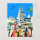 Carte postale illustrant trois chats coquets habillés en touristes devant un paysage urbain futuriste. L'architecture évoque l'esthétique de la science-fiction du milieu du siècle. Les chats tiennent des caméras, des cartes et portent des lanières, suggérant l'aventure. Des palmiers et un ciel bleu vif agrémentent l'atmosphère de vacances.