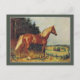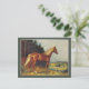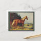 Vintage peinture à l'huile de couleur d'un cheval de couleur châtaigne avec queue et crinière flaxen debout sur une colline avec une pinède et donnant sur une ferme et le paysage de champs. Placé dans un cadre mince en argent à deux tons et en gris cuirassé.