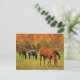 Cette carte postale présente une photographie d'art d'un beau paysage d'automne rural avec des chevaux broutant l'herbe verte. Une colline se dresse derrière eux dans les glorieuses couleurs feuillues automne de rouge, orange, or, jaune, marron et vert.