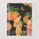 Illustration vintage d'un couple discutant sur la terrasse au clair de lune. Branches arborées aux feuilles verts, eau calme de l'océan scintillant au clair de lune et grandes lumières oranges sont apparues derrière eux.