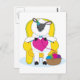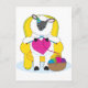 Une brebis est dans un fauteuil jaune, tricot un grand coeur rouge.