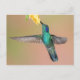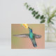 Carte postale avec un bel colibri vert violet-oreille volant vers une fleur jaune dans une forêt nuageuse. Photo prise à Tandayapa, Equateur.