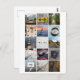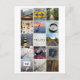 Cette carte postale est un collage d'images de voyage, comme des valises, des passeports, des flèches, des chemins, des globes et des boussoles.