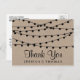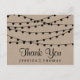 Simple mais élégant, les lampes à cordes de la collection rustique Kraft mariage est un design époustouflant avec de belles lumières à cordes blanches suspendues sur un arrière - plan à effet Kraft, qui est parfait pour toute célébration mariage rustique. Ces cartes postales de remerciement peuvent être personnalisées pour votre occasion spéciale et rendraient le remerciement parfait pour votre mariage, douche nuptiale, fête de fiançailles, fête d'anniversaire et bien d'autres occasions spéciales. Ajoutez votre libellé personnalisé à cette conception à l'aide des cases "Modifier ce modèle de conception" situées à droite de l'élément, ou cliquez sur le bouton bleu "Customiser" pour arranger le texte, modifier les polices et les couleurs et ajouter des informations ou des images supplémentaires à cette conception. AFFICHER LES ÉLÉMENTS CORRESPONDANTS POUR CETTE COLLECTION