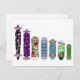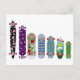 Illustration avec une gamme de planches à roulettes disposées par ordre de taille. Ils ont des graphiques colorés. Il y a une gamme de petites planches en plastique jusqu'aux longboards à ongles.