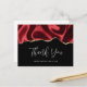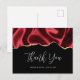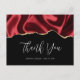 Carte de remerciement avec un design de satin faux. Rouge foncé avec des plis et un bord à paillettes dorées.