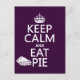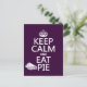On peut lire Keep Calm and Eat Pie, dans le style de l'affiche classique Keep calme. Il y a une silhouette d'une délicieuse tarte complète à côté des mots. C'est un design amusant pour tous ceux qui aiment la tarte, et l'utilise comme mesure d'urgence. De merveilleux cadeaux pour les boulangers et cuisiniers et les amateurs de tarte.