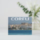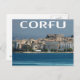 Scène de la belle île de Corfou, Grèce, montrant des bâtiments sur la côte avec des montagnes dans l'arrière - plan. Le nom Corfou est en haut en blanc dans une police art déco.