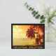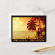 Carte postale avec coucher de soleil orange sur une plage de palmiers sur l'île tropicale de Bora Bora dans l'archipel de Tahiti Polynésie française dans l'océan Pacifique.