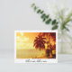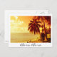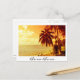 Carte postale avec coucher de soleil orange sur une plage de palmiers sur l'île tropicale de Bora Bora dans l'archipel de Tahiti Polynésie française dans l'océan Pacifique.