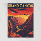Le Grand Canyon est un paysage désertique de style vintage qui abrite le majestueux Grand Canyon avec une rivière sinueuse à son pied, des formations rocheuses spectaculaires et un coucher de soleil orange et rouge vif. Deux aigles chauds s'élèvent en tête dans le ciel. "GRAND CANYON" est affiché en haut.